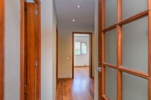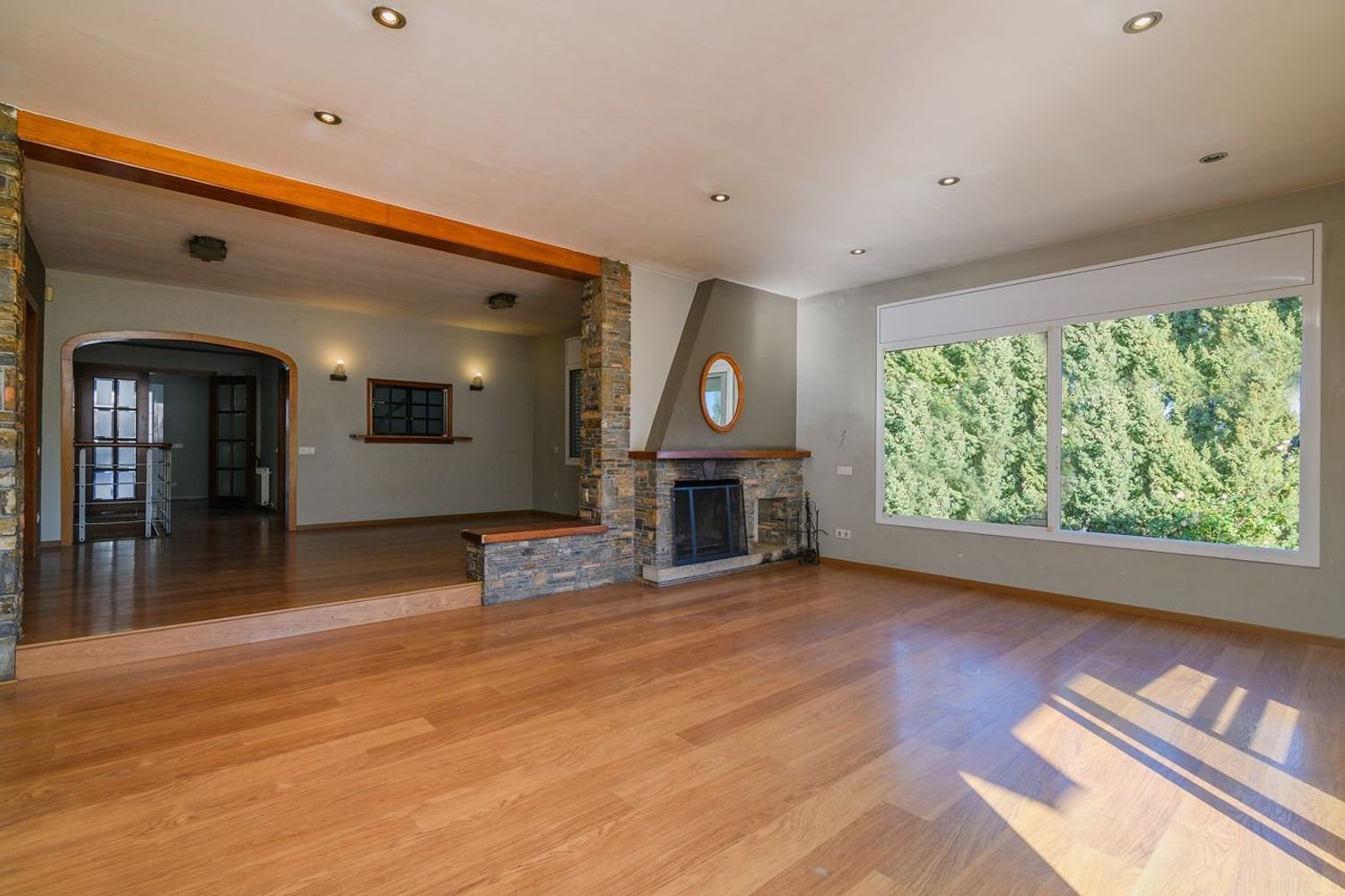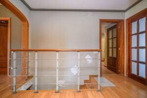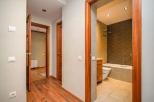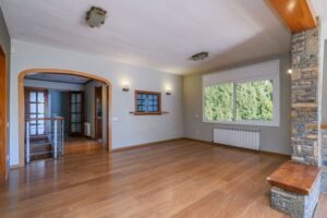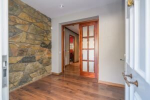Entramos en la casa y nos encontramos con un amplio recibidor con armarios para los abrigos, una puerta nos da paso al gran salón comedor con chimenea y salida a la preciosa terraza.