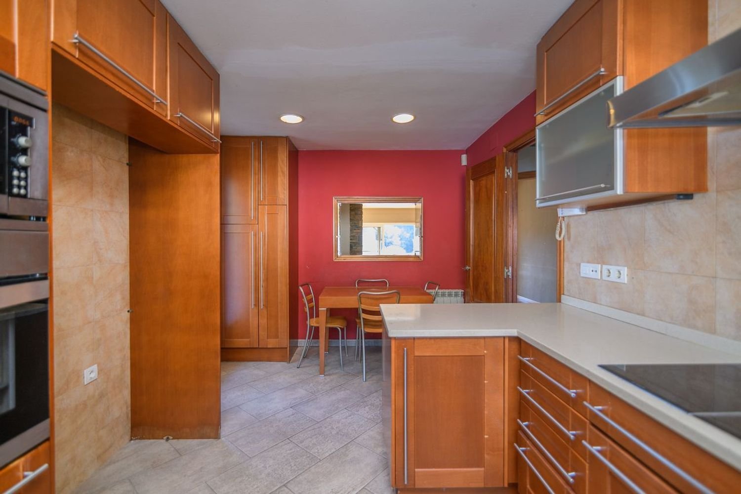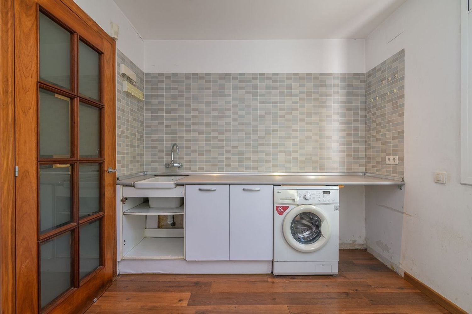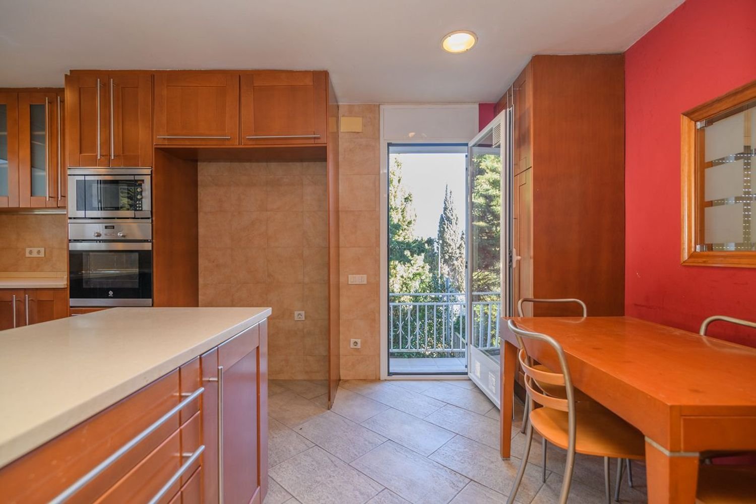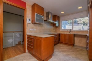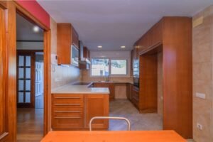 La cocina está separada del comedor por un tabique con un cómodo pasaplatos tiene ventana y puerta de salida al jardín.